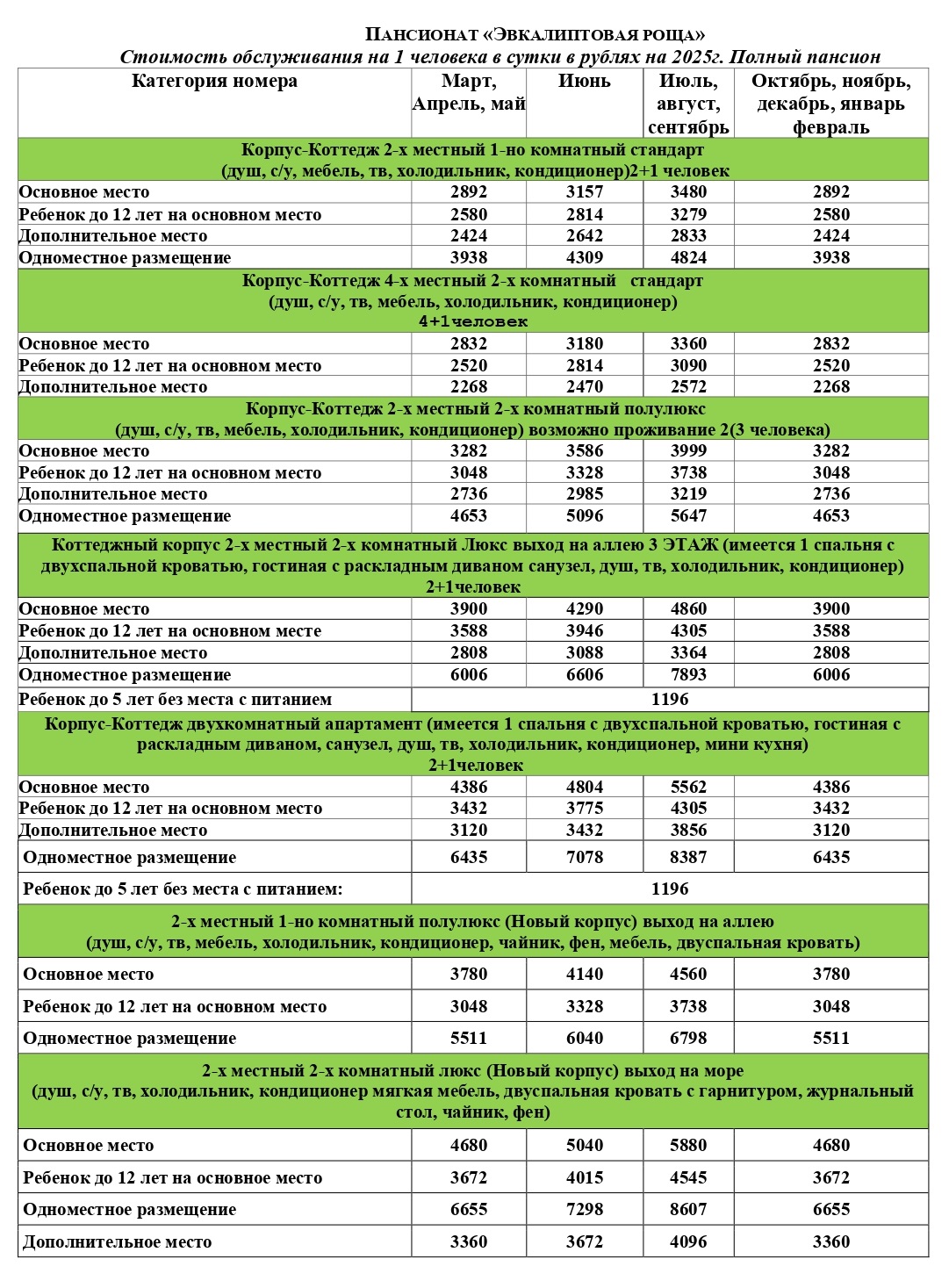 Стоимость обслуживания на 1 человека в сутки / сезон 2025-2026